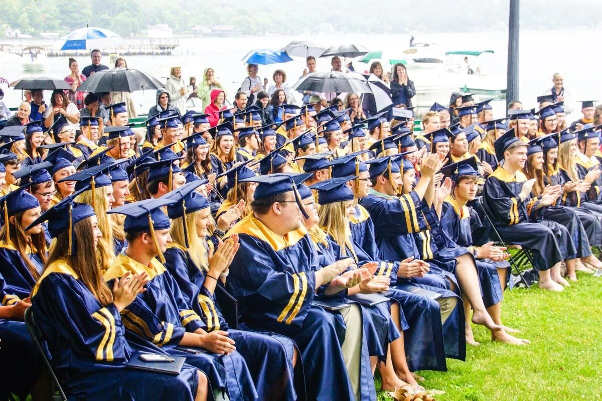 A time-honored tradition, Skaneateles graduates jump in the lake when the graduation cemonent ceremony finishes.