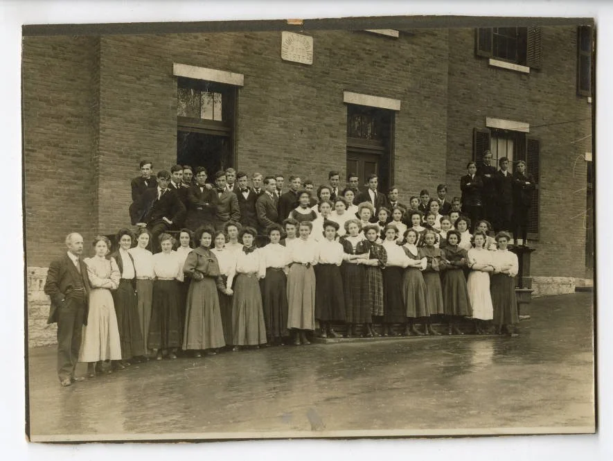 All of the students at Skaneateles Academy in 1908. The school plaque above the doorway reads, School District No. 10. 1855